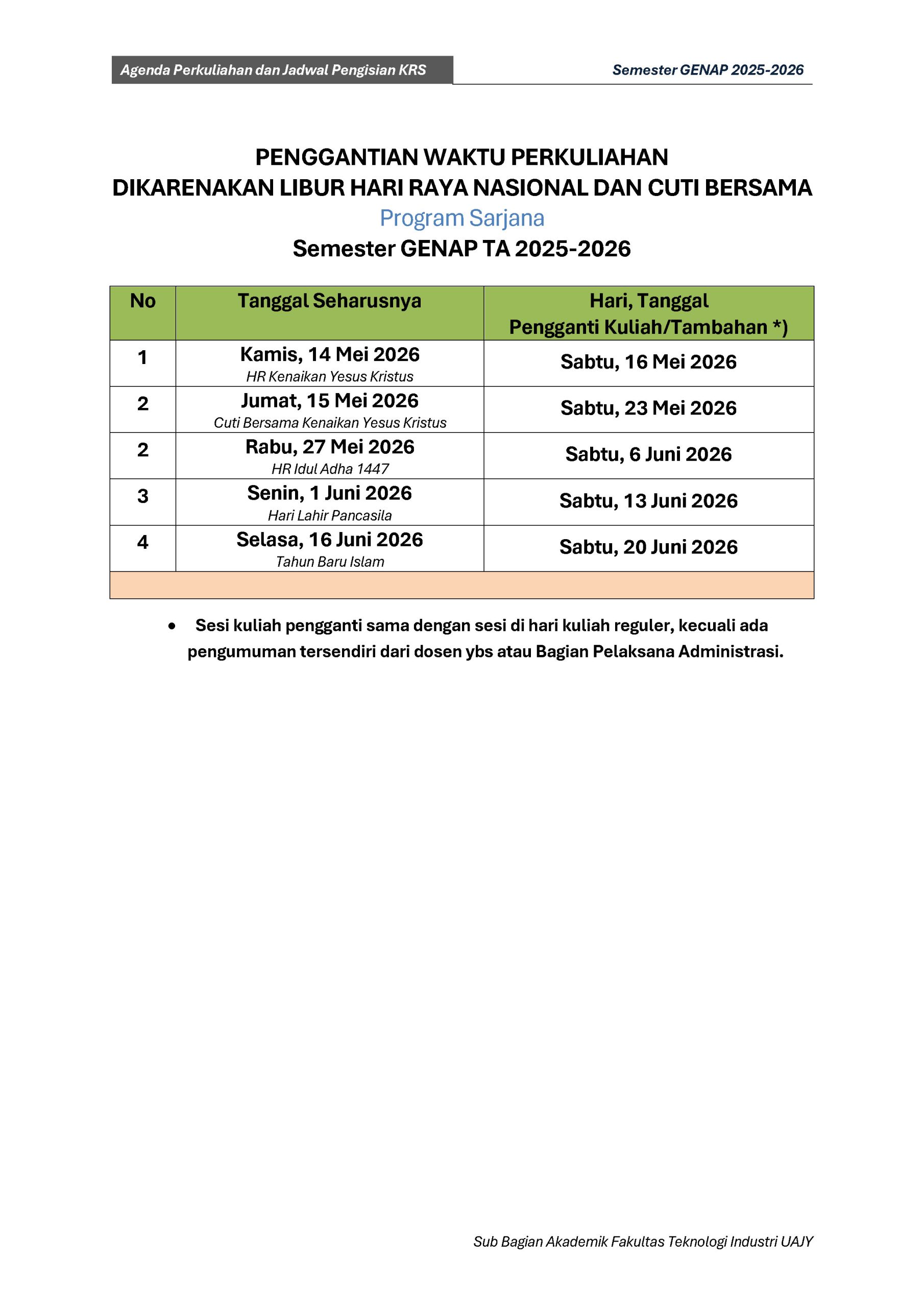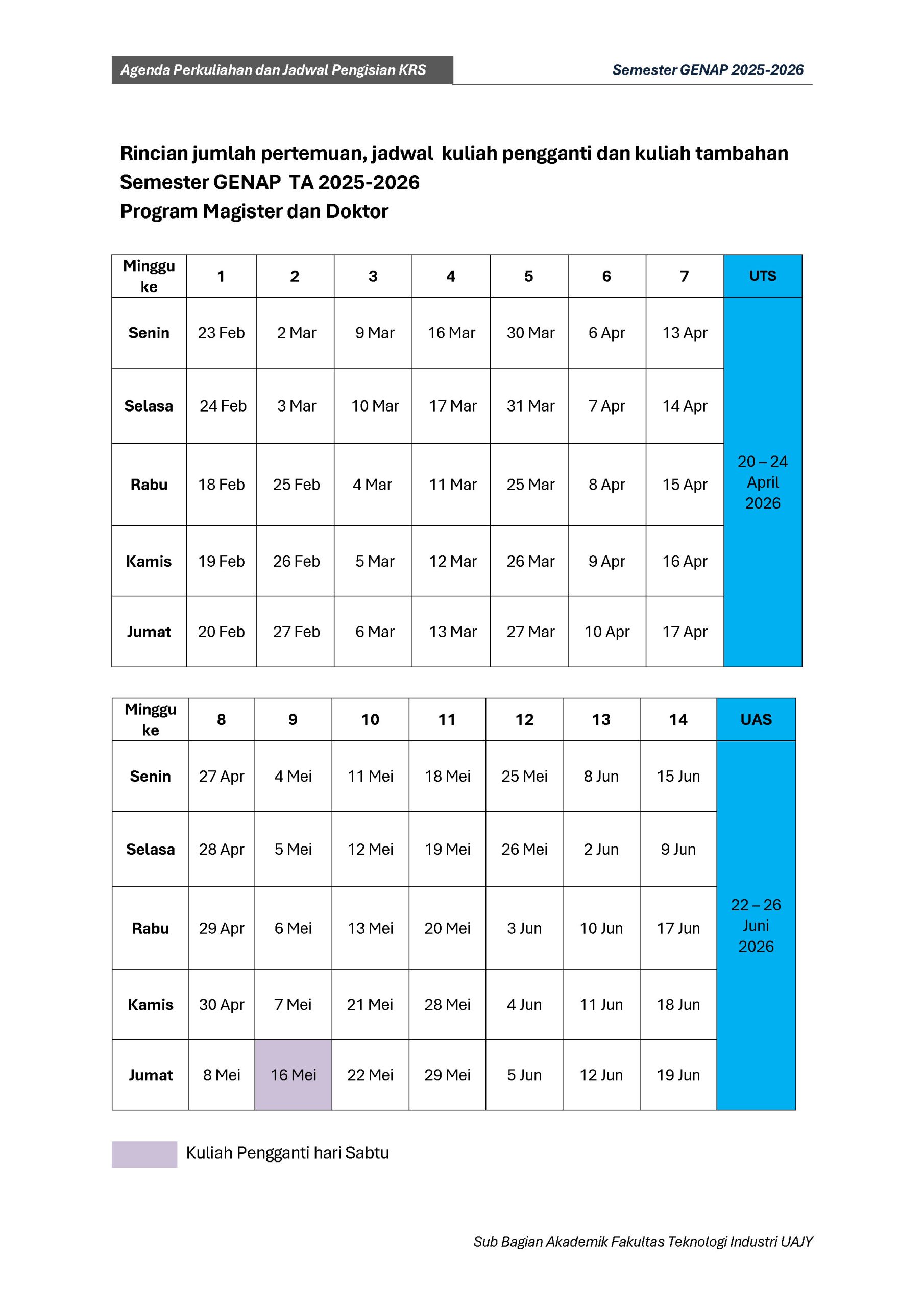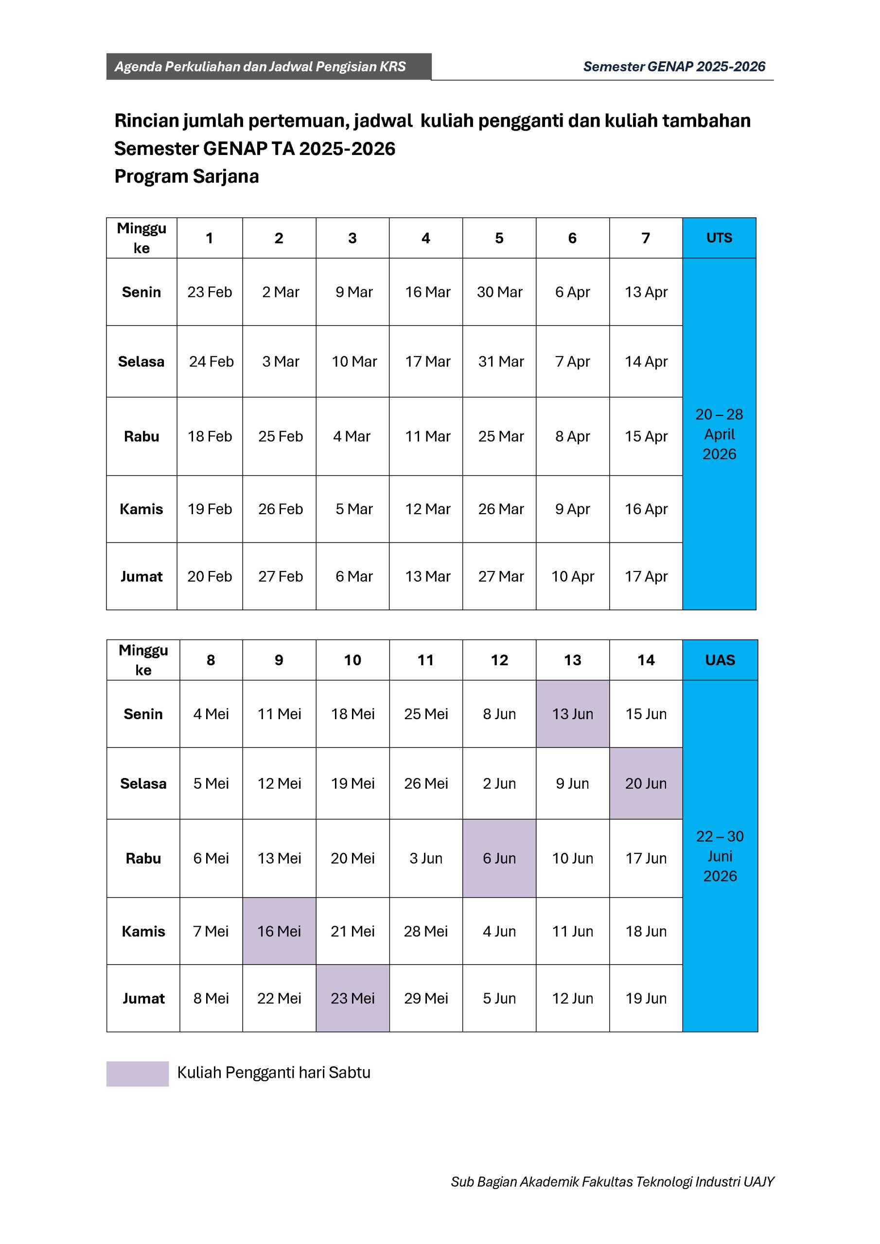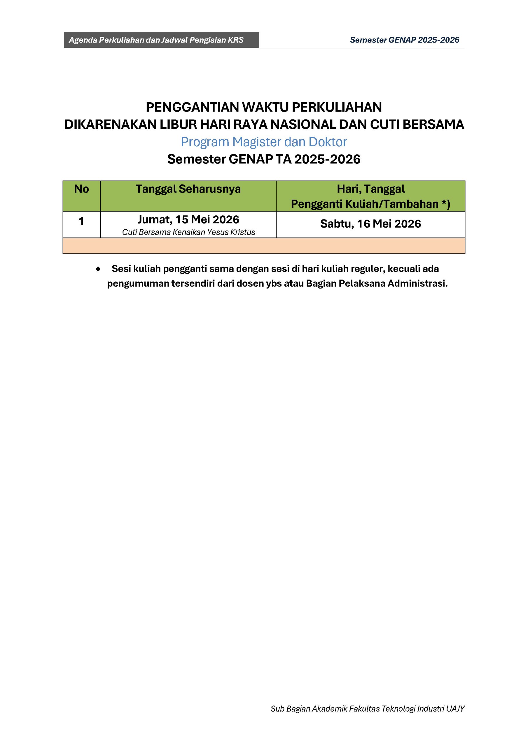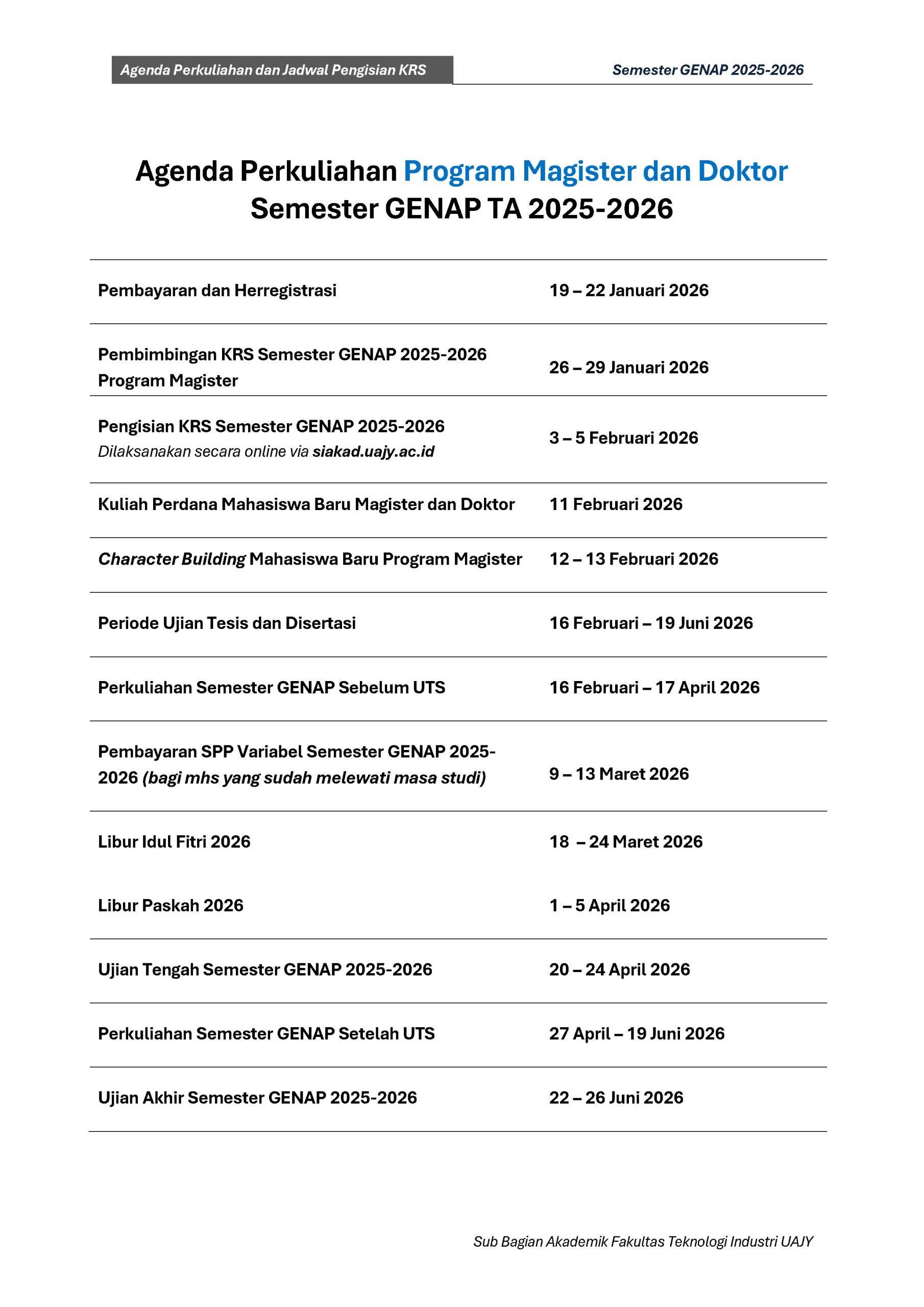 Agenda Perkuliahan Fakultas Teknologi Industri Genap TA 2025-2026 : DOWNLOAD PDF
