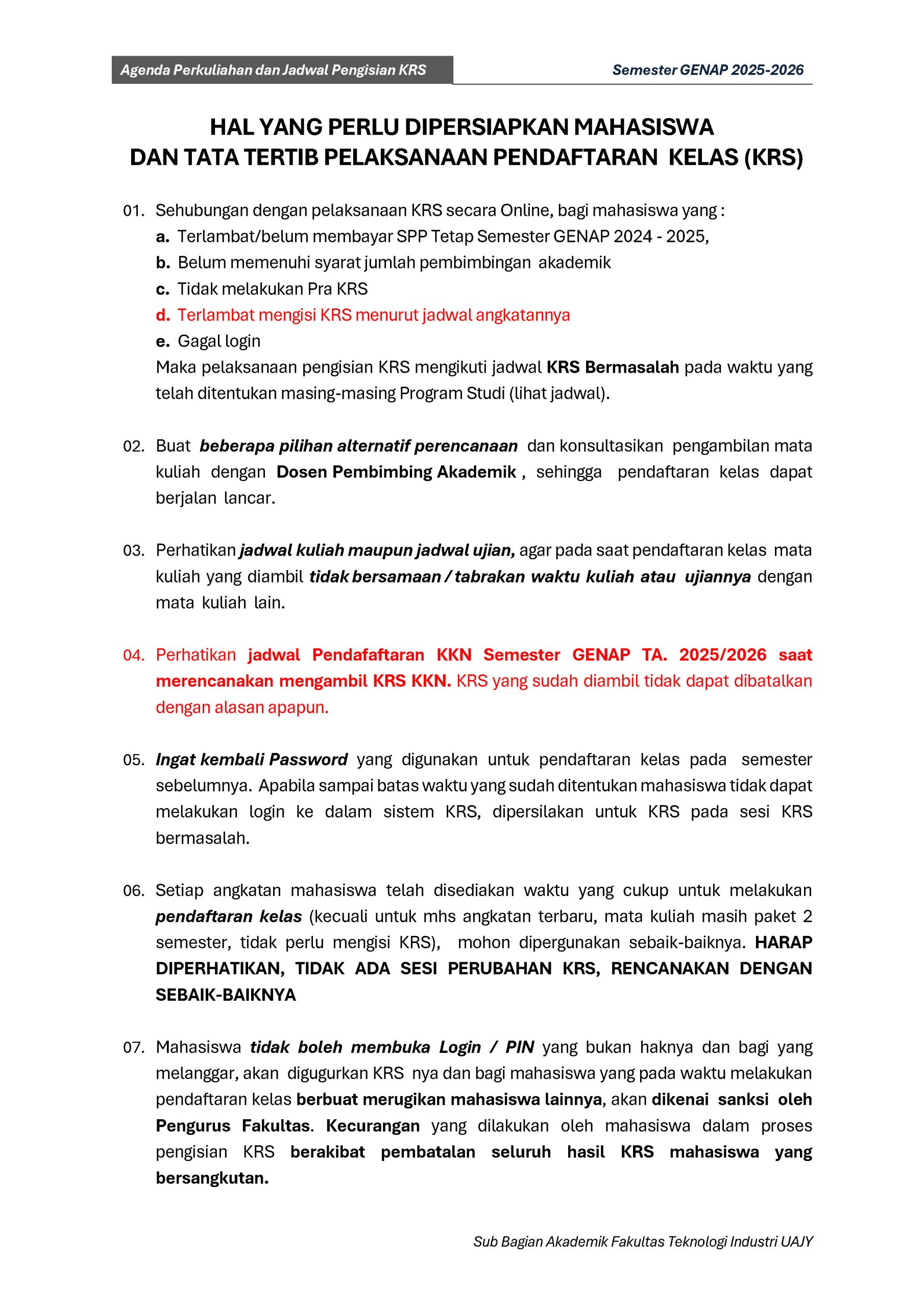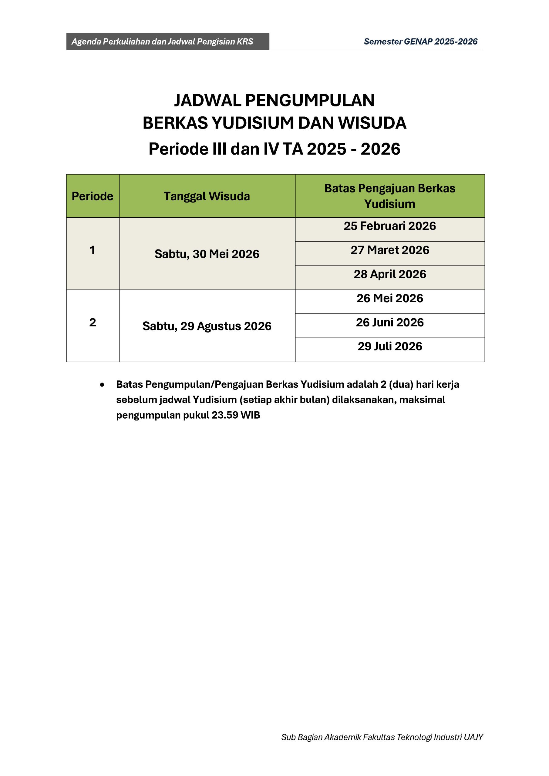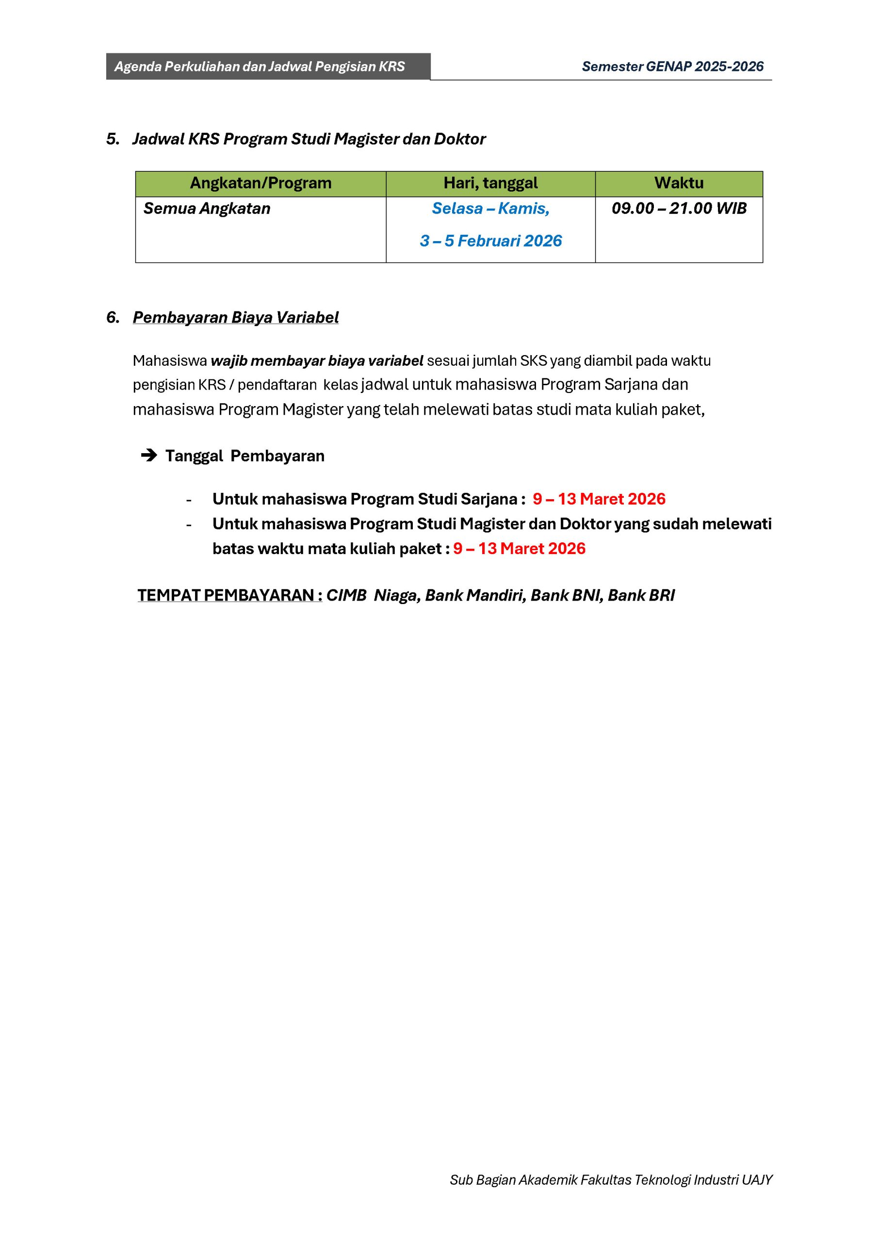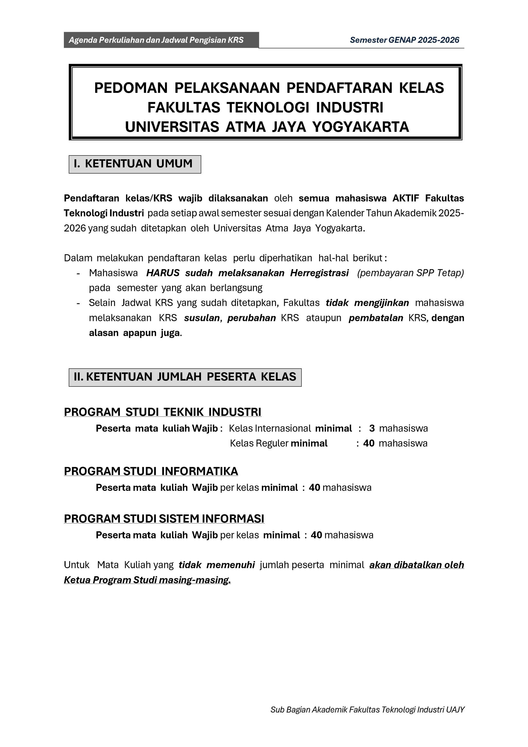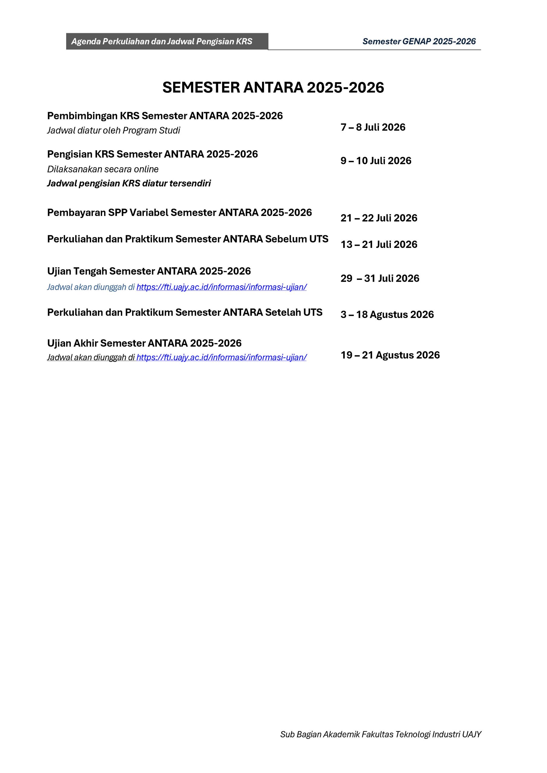 Agenda Perkuliahan Fakultas Teknologi Industri Genap TA 2025-2026 : DOWNLOAD PDF