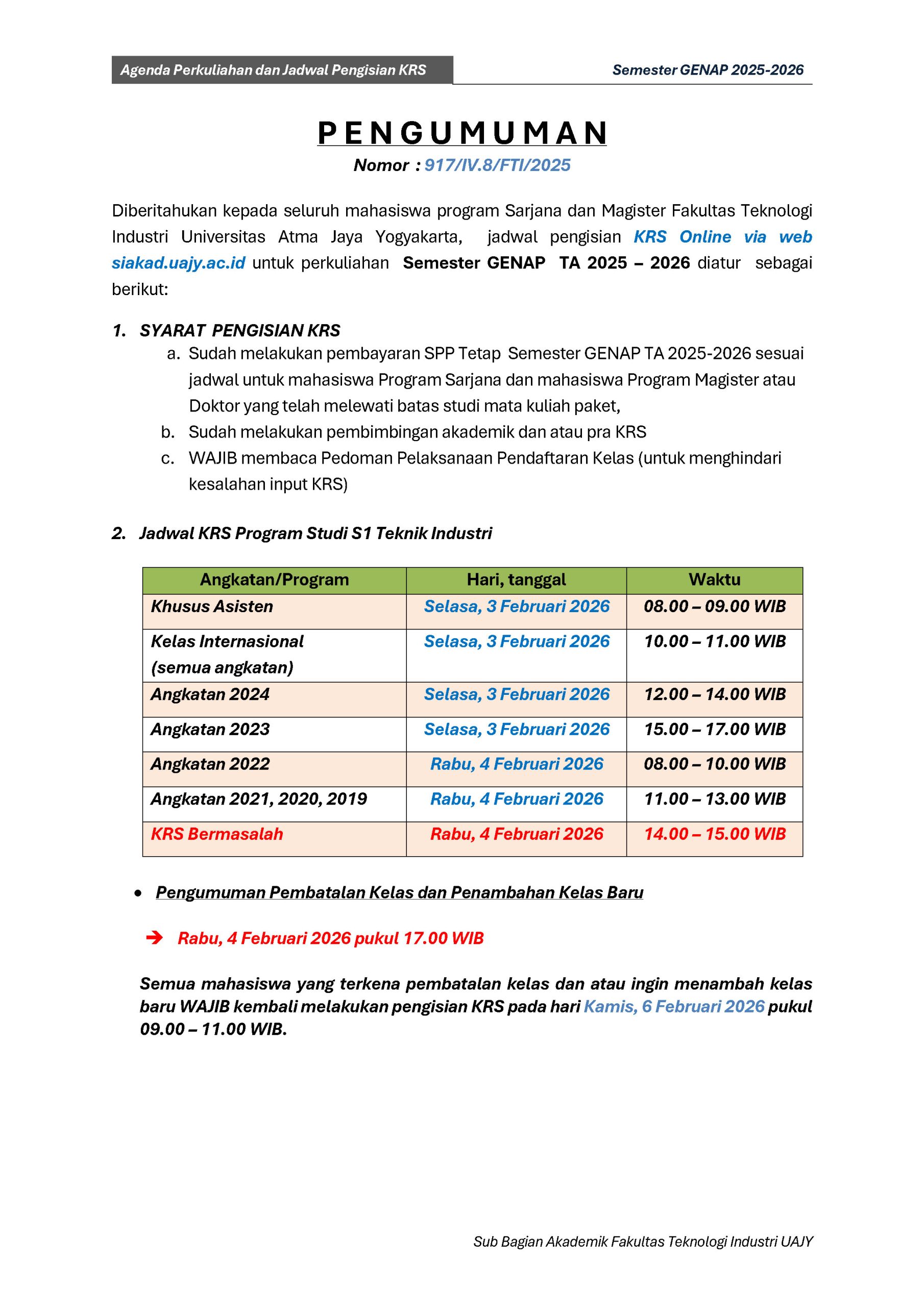 Jadwal ini kami dapatkan sebelum pelaksanaan KRS Semester Genap TA 2025/2026